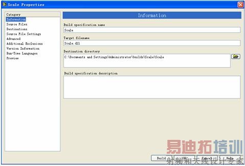 右键单击项目浏览器窗口中的Build Specifications,在快捷菜单中选择New>>Shared Library(DLL),弹出对DLL文件进行设置的对话框。点击Category>>Information,根据自己需求修改Build specification name和Target filename: