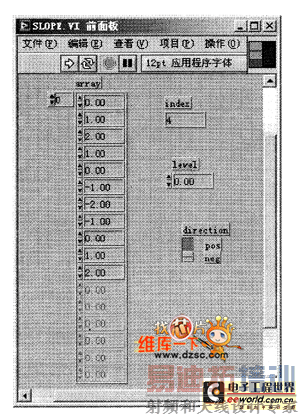 触发电平SLOPE.Ⅵ的主要功能是根据输入的信号,与触发电平的数值进行比较后输出产生触发的数组的序号index。触发电平SLOPE.Ⅵ的创建过程与前述Ⅵ的创建过程相同,图1所示为触发电平SLOPE.Ⅵ的前面板。在该前面板有输入矩阵array、输入触发电平Level以及触发极性direction(正或负触发,pos和nog)。