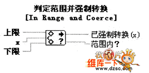 在触发电平SLOPE.Ⅵ的程序框图编写中用到了比较多的数组操作方面的内容。其中,“索引数组”和“数组大小”函数相对比较简单、比较容易理解,这几个数组操作方面的功能和特点都可以在“函数-编程→数组”子选板内找到。而“判定范围并强制转换”函数相对比较复杂,下面对这个函数稍作介绍。