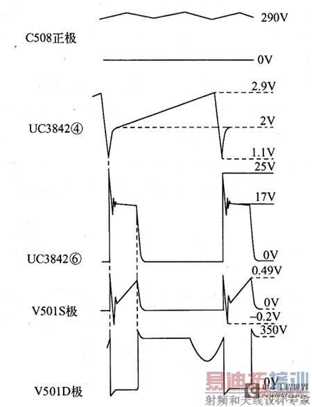 液晶显示器开关电源属大电流、高电压电路,也是故障率最高的电路,对于诸如无电压输出、输出电压过高等常见故障,用万用表查找故障不但方便,而且十分快捷,没有必要动用示波器。但是,对于一些开关电源的疑难故障,如屡损开关管及一些软故障等,示波器则可大显身手。通过测试一些关键点的波形,可快速圈定故障范围,查找到故障点。开关电源部分要检查的波形比较少,以图1所示的电源适配器为例,主要测试的波形有以下几个:①整流滤波以后的波形(C104正极的波形);②电源控制芯片UC3842的4脚的锯齿波电压波形;③UC3842的6脚输出的驱动脉冲波形;④场效应开关管Q101的漏极(D)和源极(s)波形等,如图2所示。
