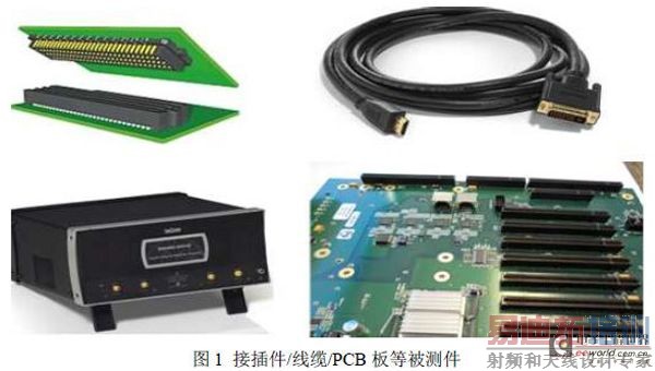 对于相当多的被测试产品,如接插件、使用插槽的电路板等都需要使用专门的夹具才能进行S 参数测试,这是因为这些被测件的接口通常是非SMA 或者BNC 等通用接口类型的,而S 参数测试仪器如SPARQ、VNA 等仪器的连接接口通常都是SMA 或者BNC 等标准类型的,因此被测件和测试仪器的连接需要辅助夹具。如下图1 所示为一些需要夹具才能够进行S 参数测试的被测件(左下脚图片为Teledyne LeCroy(力科)的信号完整性S 参数测试仪):