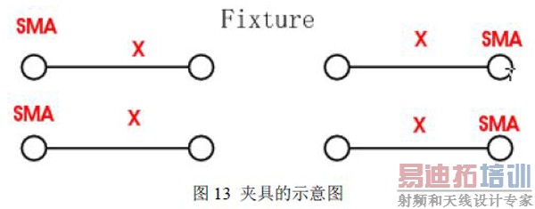 如果夹具或者探头的延时和损耗参数是未知的,那么也可以通过使用2X 直通线来估计夹具或者探头的延时和损耗。因此在夹具设计时,建议在夹具上增加一条2X 直通线,以用于测量夹具/探头的损耗。如下图13 所示为一个夹具的示意图,标注SMA 的端口是与测试仪器相连接的,标志SMA 的端口的线段的另外一个端口为与被测件DUT 相连接的。这个线段的长度为X,那么2X 直通线即是指两个端口都有SMA 接口的且长度为2X 的直通连线。
