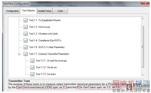 PCIE 3.0发射机测试项目,如下图(力科的一致性测试软件中包含的测试项目)所示为PCIE 3.0的CEM规范(Ver0.3)以及PCIE 3.0的基本规范(Rev3.0,Ver0.9)中规定的发射机测试项目。
