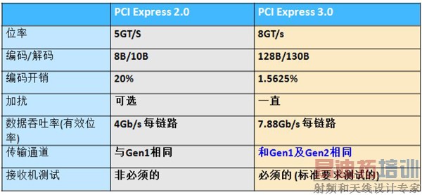PCIE 3.0相对于它的前一代PCIE 2.0的最主要的一个区别是速率由5GT/s提升到了8GT/s。为了保证数据传输密度和直流平衡以及时钟恢复,PCIE 2.0中使用了8B/10B编码,即将每8位有效数据编码为10位数据进行传输,这样链路中将会有20%信息量是无效的,即使得链路的最大传输容量打了20%的折扣。而速率提升的目的是为了更快的传输数据,编码方式也不可或缺,因此在PCIE 3.0中还通过使用128B/130B的编码方式(无效信息量减低为1.5625%),同时使用加扰的方式(即数据流先和一个多项式异或得到一个更加随机性的数据,到接收端使用同样的多项式将其恢复出来)来实现数据传输密度和直流平衡以及时钟恢复的实现。另外一个区别是,PCIE 3.0规范已经要求接收机测试为必测项目,而PCIE 2.0是选测项目。下表所示为PCI Express 2.0与PCI Express 3.0的主要不同点的对比。