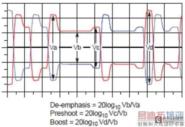 PCIE 3.0规范中对这11种等级的去加重(de-emphasis)和前冲(preshoot)功能做了规定,因此PCIE 3.0发射机测试中需要对这11种预加重和均衡进行测试,即验证发送端芯片的de-emphasis及preshoot的能力,以确保其能够满足规范的要求。如下图所示为De-emphasis和Preshoot以及Boost的定义和计算方法。