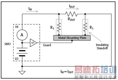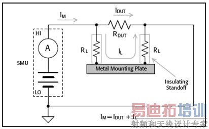 图 1 绝缘体中产生的电流影响待测器件电流的测量。为了实现测量误差最小化,要确保绝缘体电阻(RL)比待测器件电阻(RDUT)高得多。