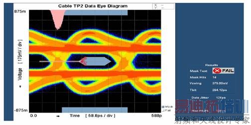 问题如此严重,我没法再犹豫,直接跑到客户测试现场,由客户给我演示了一下测试过程,她们使用的系统是DTG5334+AFG3102+DPO72004+HDMI software,确实如她们所说,测试结果是Fail的。结果如下图一,可以看到信号的抖动和垂直噪声都比较大。我仔细检查了一下她们的设置后,在HDMI测试探头上按了一下,将探头的衰减比例从12.5X切换到2.5X的衰减,在重新测试了一次,得到下图二的结果。可以看到,信号的抖动和噪声都明显的好转,模板测试的余量增加很大。当时我明显听到感觉到她们长长的舒了一口气。