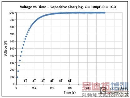 图 1 100pF电容器充电的电压时间曲线。读数设置为时间常数的4~6倍。T = RC时间常数。