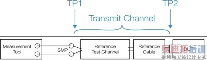 图6显示了标准化的发射机一致性测试设置,包括参考测试通道和电缆。测试点2 (TP2)距被测器件(DUT)最近,测试点1 (TP1)则是远端的测量点。注意,所有发射机标准化的测量都在TP1的信号上执行。