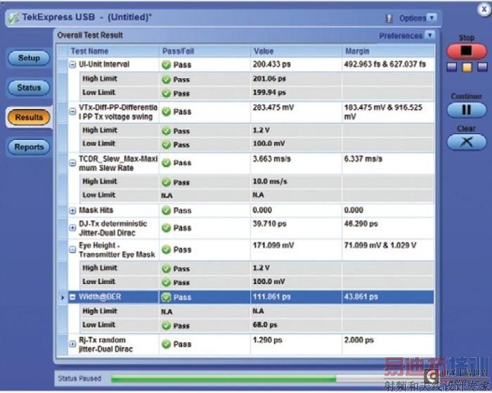 在TP1采集信号之后,数据使用称为SigTest的软件工具处理,这与官方PCI Express一致性测试类似。对要求预一致性测试、检定或调试的应用,可以使用其它工具,进一步了解变化条件或参数下的设计特点。带有选项USB-TX的泰克MSO/DPO/DSA70000系列示波器可以执行所有USB 3.0标准化和信息性物理层发射机测试,如图7所示。单键自动软件工具,如USB-TX,通过保证正确配置测试设备,节约了时间。实验室技术人员就可以准确地运行测试,而不是非得要深入了解USB规范的高级工程师。在测试结束后,详细的测试通过/失败报告将列出可能发生设计问题的地方。如果不同测试地点(如公司实验室、测试机构、等等)得到的结果相互矛盾,可以使用以前运行的测试中保存的数据运行测试。
