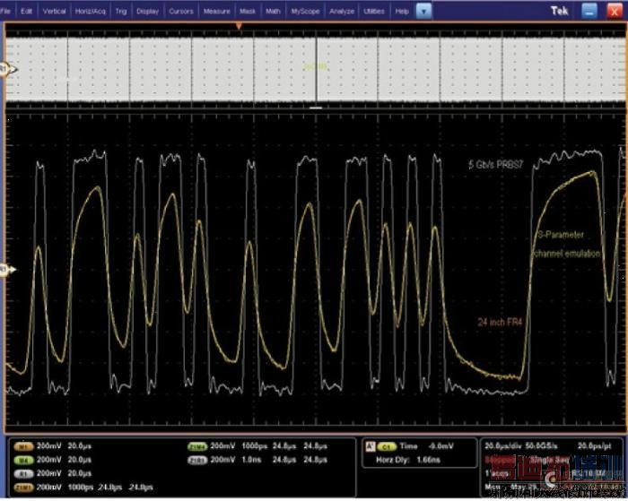 在包括硬件通道时、在没有包括硬件通道时都要采集测试信号。图11和图12显示了每个轨迹长度的原始信号(白色)、远端硬件响应(橙色)和使用S参数数据卷积后的原始信号。图13包括来自基于硬件和基于软件的测试数据的眼图。 [p]