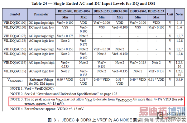 由于低电压电源的噪声要求越来越严格,比如JEDEC规范中规定了DDR3的VREF的电源噪声在+/-1%VDD以内(如上图2),1.5V x 1% = 15mV,即电源噪声的峰峰值不大于30mV;而Xilinx的Virtex-7 FPGA要求电源供电在10kHz-80MHz范围内电压变化峰峰值不超过10mV。测量这类噪声较小的电源非常具有挑战,而以下几点会影响到电源噪声测量的准确性: