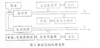 本仪器由流量传感器、电流传感器、电压传感器、温度传感器、泵、电加热器;管道和主机等缓威.结构面匡如图1所示。
