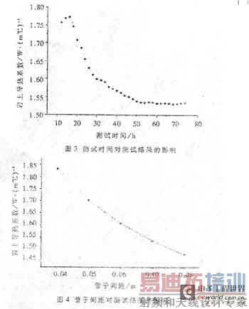 维持其它条件不变,只改变导管上升管与下降管之间的间距,其对岩土导热系数的影响见图4。当管间距变化约为0.0lm时.计算出的导热系数变化约为4~8%。由图中可以看出,间距越大,计算出的导热系数越小:这是由于间距越大,钻孔内的热阻越小,在总热阻不变的情况下.周围岩土的导热热阻大。即导热系数小。因此如何确定管于间距是设计地源热泵系统中值得认真探讨的问题。