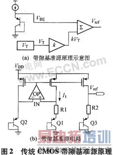 图2(b)是传统的CMOS带隙电压基准源电路,图中运算放大器的作用是使电路处于深度负反馈状态,从而让运算放大器两输入端电压相等。