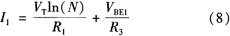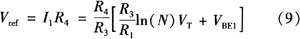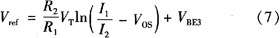 结压降VBE在室温下温度系数约-2.0 mV/K,而热电压VT(VT=k0T/q),在室温下的温度系数为0.085 mV/K,将VT乘以常数k并与KBE相加,可得到输出电压Vref为: