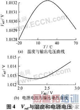 后,可以方便地调节R4的值来调节参考电压的输出大小,正是由于运算放大器两输入端的接地电阻R2、R3的增加,使得总的镜像电流通过电阻R4后可以方便地改变输出大小,相比文献[3]中的二次分压结构更简单,更节省面积。