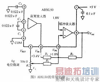 图3为一个更常用的电路。其中使用了ADXL50片内提供的3.4 V参考电压,增加了一个电位器Rt。这时的Vout由下式确定: