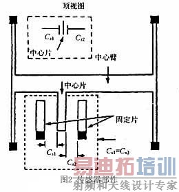 图1(a)为加速度传感器的原理框图。 图中的传感器部件是整个器件的关键部件,其原理如图2所示。图2中只绘出了传感器部件的一个电容单元,他由1片中心片和相互独立的2片固定片组成,2片固定片等距排列在中心片的两侧。 实际的传感器部件包括一组共42片中心片,这些中心片固定在一个中心臂上,中心臂可带着42片中心片沿图中水平方向移动。