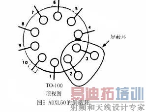 减小C1可以提高系统对快速加速度变化的反应速度,但会增大解调器输出的噪声,因为系统的噪声与带宽的平方根成正比。可在缓冲放大级中增加低通滤波功能以提高信噪比。在电路板设计时要注意减小或消除C1对地或对电源的漏电。电流从C1两脚泄漏路径不平衡会使0 g电平漂移,影响很大。可在印制电路板的两面制作如图5所示的屏蔽环,屏蔽环包含C1的两脚及连线,并与ADXL50的第④脚相通。使C1的两脚与ADXL50的第④脚大致处于相同的电位。注意屏蔽环要尽量远离C1两脚及其连线。