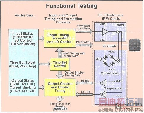 当功能测试执行的时候,测试系统把输入波形施加给待测器件,并一个周期一个周期,一个管脚一个管脚地监控输出数据。如果有任何的输出数据不符合预期的逻辑状态,电压或者时序,该测试结果被记录为错误。