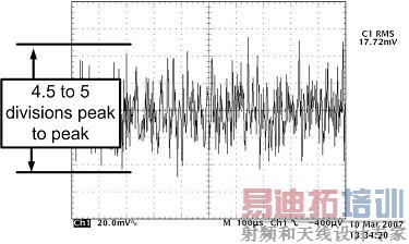数字和模拟示波器均可用于噪声测量。由于噪声在性质方面的随意性,因此噪声信号不能触发模拟示波器,只有重复性波形才能触发模拟示波器。然而,当存在噪声源输入时,模拟示波器上则显示出独特的影像。图 5.3 显示了采用模拟示波器进行宽带测量得出的结果。值得注意的是,由于显示的荧光特性以及噪声对模拟示波器的非触发性,模拟示波器常常生成一般和“拖尾”波形。大多数标准模拟示波器的缺点就是,它们不能检测到低频噪声(1/f 噪声)。