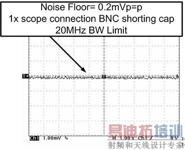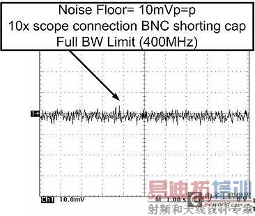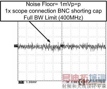 当使用示波器测量噪声时,应遵循一些通用指南。首先,在测量噪声信号前,有一项重要的工作就是检查示波器的固有噪声。这项检查工作可以通过连接示波器输入端的 BNC 短路电容器 (shorting cap),或将示波器引线与接地短路连接(如果采用了 1x 探针)。这种考虑之所以这么重要,是因为采用 1x 探针时的测量范围会小 10 倍。大多数质量上乘的示波器都拥有 1mV/division 量程,并配有 1x 示波器探针或 BNC 直接连接;同时,还具有带 10x 探针的 10mV/division 固有噪声。