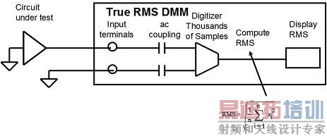 许多高精度的数字万用表(DMM) 都具有真正的 RMS 功能。通常而言,数字万用表通过将输入电压数字化、采集数以千计的样本并对 RMS 值进行数学计算,来实现上述功能。一款 DMM 在完成该测量时通常要具备两种设置:“AC 设置”以及“AC+DC 设置”。在“AC”设置模式下,DMM 输入电压为连接到数字转换器的 AC 电压。因此,此时 DC 组件处于隔离状态——这是进行宽带噪声测量理想的运行模式,因为,从数学层面上来说,测量结果等同于噪声的标准偏差。在“AC+DC”设置模式下,输入信号直接被数字化,同时完成了对 RMS 值的计算。这种运行模式不能用于宽带噪声测量。如欲了解典型的高精度真正 RMS 表的结构图,敬请参阅图 5.1。