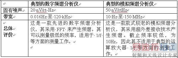 当使用(或选择)频谱分析仪时,我们需要考虑的主要技术规范就是固有噪声和带宽。图 5.23 中的表格列出了两款不同频谱分析仪的部分技术规范。