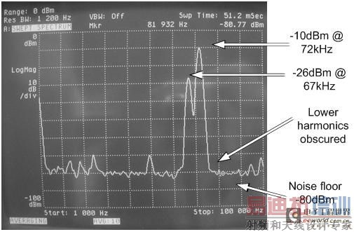 从图 5.13 – 5.14 中,我们可以看出,当分辨率带宽降低时,固有噪声则从 –87 dBm 增加到 –80 dBm。另一方面,当分辨率带宽发生改变时,频率处于 67 kHz 和 72 kHz 时的信号幅度并未发生改变。固有噪声之所以受分辨率带宽的影响,是因为其为热噪声,因此,带宽的提高也增加了热噪声总量。另外,由于信号波形为正弦波曲线,而且不管带宽如何变化,带通滤波器内部的振幅都会保持恒定,因此,频率处于 67 kHz 和 72kHz 时的信号幅度并不会受分辨率带宽的影响。因为我们必须清楚在频谱密度计算中不应该包含离散信号,所以,有关噪声分析方面的特性应引起我们足够的重视。比如,当测量运算放大器的噪声频谱密度时,您会发现频率在 60 Hz(功率上升线)时出现的一个离散信号。因为这个 60 Hz 的信号并非频谱密度,而是一个离散信号,所以它并未包含在功率噪声频谱密度曲线中。 [p]
