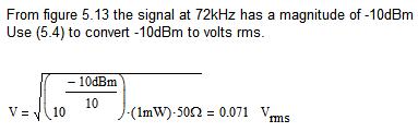 在图 5.13 和图 5.14 中,频谱的大小以分贝毫瓦 (dBm) 为单位表示,这是频谱分析仪常用的测量单位。一分贝毫瓦是指相对于一毫瓦,用分贝来计量的功率比值。就本例中的频谱分析仪而言,分贝毫瓦的测量也要事先假设输入阻抗为 50 欧姆。对大多数的频谱分析仪而言,当输入阻抗选择为 1M 欧姆时,情况也是如此。图 5.15列出了将分贝毫瓦转化为电压有效值所采用公式的推导过程。在图 5.16 中,该公式用于计算在图 5.13 – 5.14 中列出的测量结果 —— –10 dBm信号的电压有效值。