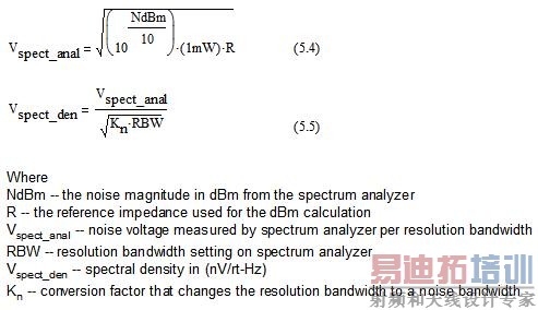 一些频谱分析仪同噪声频谱密度一样,可以 nV/rt-Hz 为单位显示频谱幅度。但是,如果不具备这种功能,我们可以用频谱幅度除以分辨率噪声带宽的平方根来计算频谱密度。需要说明的是,通常我们需要一个换算系数,将分辨率带宽转化成分辨率噪声带宽。图 5.17 给出了将分贝毫瓦频谱转化成频谱密度的方程式。图 5.17 还给出了将分辨率带宽转化成噪声带宽所需的换算系数表。图 5.18 显示了将示例频谱分析仪中的频谱转化为频谱密度的实例。