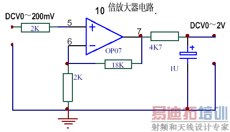 下图是一个最简单的 10 倍放大电路,运算放大器使用的是精度比较高的 OP07 ,利用它,可以把 0~200mV 的电压放大到 0~2.000V。在使用的数字电压表量程为 2.000V 时,(例如 ICL7135 组成的 41/2 数字电压表,基本量程就是 2.000V。)特别有用。