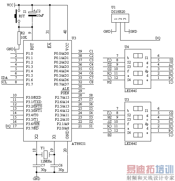 由于DS18B20采用的是1-Wire总线协议方式,即在一根数据线实现数据的双向传输,而对AT89S51单片机来说,硬件上并不支持单总线协议,因此,我们必须采用软件的方法来模拟单总线的协议时序来完成对DS18B20芯片的访问。