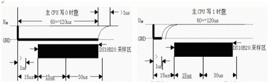 对于DS18B20写0时序和写1时序的要求不同,当要写0时序时,单总线要被拉低至少60us,保证DS18B20能够在15us到45us之间能够正确地采样IO总线上的“0”电平,当要写1时序时,单总线被拉低之后,在15us之内就得释放单总线。