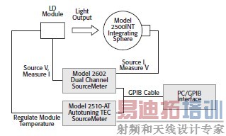 图1示出了LIV测试系统的组成,包括2602型源表、2510-AT型自动温度控制源表和一台配备了GPIB接口板的计算机。