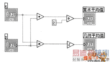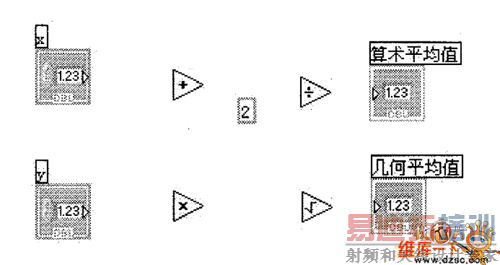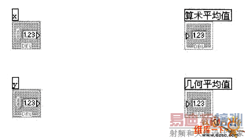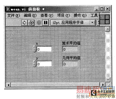 · 第2步:创建前面板。在前面板窗口中,通过控件选板的“新式→数值”子选板,添加两个数值输入控件,直接用键盘输入将标签分别命名为x和y;添加两个数值显示控件,标签分别命名为“算术平均值”和“几何平均值”,如图1所示。