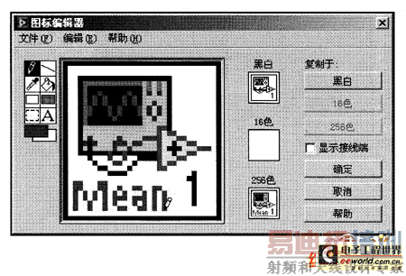 · 第4步:创建图标。在前面板窗口右上角的VI图标上单击鼠标右键,在弹出的快捷菜单中选择“编辑图标.¨”,打开图标编辑器窗口,如图6所示。使用图标编辑工具编辑图标,编辑完成后单击“确定”保存编辑效果。