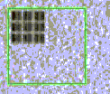为定位需要,经Philips的LCD驱动产生定位用模板图如图2-1所示。在液晶显示矩阵的四角各显示四个定位用方形小块作为将来模板识别(pattern match)时用的标准图形模板。在每个镜头 的标准图像中,在自学习标准图像的时候,会自动将工程师定义的每个镜头的左右两个模板的图像及其坐标保存下来(如图2-2左镜头左模板,绿框内部分)。则在定位用的标准图像上,必有一对定位模板。在检测产品时,首先产生图2-1所示的跳图,由于labVIEW具有功能强大的模板识别功能,其在目标图像上搜寻图形模板的精确坐标的精度非常高,所以本系统利用保存在硬盘中的模板在采集图像上进行模板识别,然后将找到的模板坐标与保存在硬盘上的标准图像上相应模板的坐标进行比较,就可以知道究竟采集图像有多少位移和旋转。然后将将标准图像相应位移并旋转,这样就可以进行图像相减了。
