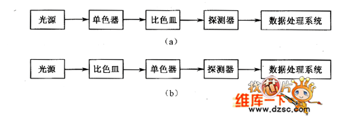 生化分析仪有两种光电比色方法:前分光和后分光如图1所示。图1(a)采用的是前分光,即先通过单色器分光后再入射到比色皿。图1(b)采用的是后分光,即从光源发射的复合光先通过比色皿后再经单色器分光。对于前分光式的分光光度计,由于通过吸收池的是单色光,所以没有其他波长单色光的干扰。但是测试速度相对较慢,不能同时完成多波长测试。对于后分光式的分光光度计,由于光先通过吸收池再由单色器分光,所以可采用面阵CCD、光电二极管阵列等光电探测器同时对几个波长进行测试,速度快。