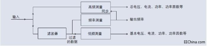 对大多数功率分析仪来说,这带来的问题是:如果在高频测量,那么波形中的低频信息将丢失;如果滤除脉宽调制波形在低频测量,那么高频数据将丢失。这个难题的出现是因为在低频对波形进行调制。因此,高频测量( 如总电压有效值、总功率等) 必须在高频处进行,但必须超出输出波形低频分量的整数倍。