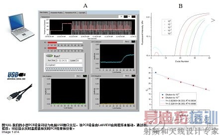 利用该系统同时运行包含预加载PCR反应物的三个聚合物,从抽样到结果所花费时间不到一小时,并且允许采用大量生物的多样性。利用热敏电阻的实时温度反馈,一个内部比例积分微分(PID)芯片来处理温度控制。该控制器由一个补偿器,输出装置和传感器反馈信号组成,反馈信号对于控制加热器输出功率,以及保持温度是很必要的。使用LabVIEW软件,我们对图形用户接口进行编程,以显示实时温度,设置温度,并且显示来自三个通道的实时PCR结果 (如图1A所示)。