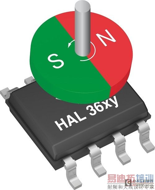 图2:径向充磁的磁铁平行于HAL36xy的表面转动