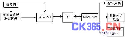 将生产好后的两块面板放入手机电路板测试机箱的卡槽中,当检测到5V触发信号后,系统开始对面板进行检测。每块面板各有四个点的电压待测量,同时将电压值转换为流明值,每块面板的4个值有一个不在正常工作范围内,该面板不合格;反之,该面板合格。 系统包括硬件和软件两个部分组成,系统的组成框图如图所示。硬件由NI公司提供的PCI-6220M系列多功能采集卡。软件是在Labview7.1平台上进行编写完成信号采集、数据处理分析、结果记录和统计三部分。