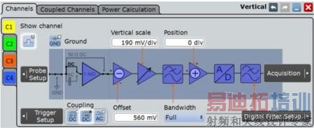 我个人十分喜欢这个界面,与很多产品传统的参数表格模式不同,这个框图的布局跟示波器正常工作过程的流程是一致的,并且将参数设置环绕在对应单元的旁边,这对于基本功不扎实的新手十分有帮助,能减小选错配置的可能性。我相信大家常常会碰见不小心选错了输入阻抗(50 ohms选到了1M ohms,甚至选到了GND)导致测量信号不正确,或者是没有搞清楚Offset和Position的区别,导致ADC被饱和。那么这种完整给出原理图的界面就会减小犯这些错误的概率。