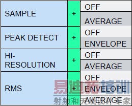 在《示波器的抽取模式》一文中已说明抽取的四种模式分别为:SAMPLE,PEAK-DETECT,HI-RESOLUTION,RMS。本文所要介绍的波形算法分为如下三种:OFF,ENVELOPE,AVERAGE。可以实现的组合如下图2所示。