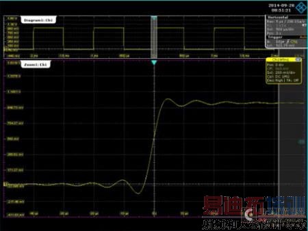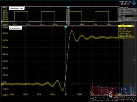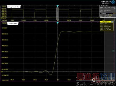 在HI-RESOLUTION模式下,对采集的数据点先做了高精度计算,在这个模式下可以达到12bit分析精度,见图8,为没有做任何波形算法的测试波形。对这样的连续N个HI-RESOLUTION抽取的波形,再做AVERAGE算法,进一步减少了测试幅值的随机波动,这样测试出来的幅值会更加接近真实值,减少测试误差,有图9的测试波形可以看出,在HI-RESOLUTION抽取模式下,对比在做AVERAGE和没做时的波形,做AVERAGE算法的测试波形比较平滑,消除随机误差,但是需要注意的是,这个算法只能适用在周期信号测试。