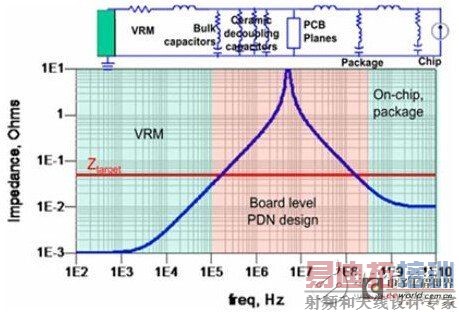 在调试该故障前先回顾下电源噪声抑制的原理。如下图所示,电源分配网络中不同的频段由不同的元件来抑制噪声,去耦元件包含电源调整模块(VRM)、去耦电容、PCB电源地平面对、器件封装和芯片。VRM包含电源芯片及外围的输出电容,大约作用于DC到低频段(100K左右),其等效模型是一个电阻和一个电感组成的二元件模型。去耦电容最好使用多个数量级容值的电容配合使用,充分覆盖中频段(数10K到100M左右)。由于布线电感和封装电感的存在,即时大量堆砌去耦电容也难以在更高频起到作用。PCB电源地平面对形成了一个平板电容,也具有去耦作用,大约作用在数十兆。芯片封装和芯片负责高频段(100M以上),目前的高端器件一般会在封装上增加去耦电容,此时PCB上的去耦范围可以降低到数十兆甚至几兆。因此,在电流负载不变的情况下,我们只要判断出电压噪声出现在哪个频段,那么针对这个频段所对应的去耦元件进行优化即可。在两个去耦元件的相邻频段时两个去耦元件会配合作用,所以在分析去耦元件临界点时相邻频段的去耦元件也要同时纳入考虑。