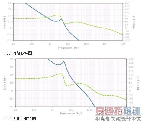 一般来说,11.3KHz应该是VRM的管辖范围,此处出现较大噪声说明VRM电路设计不能满足要求。这里对VRM的性能进行分析,VRM分析的方法众多,此处主要采用仿真其反馈环路波特图的手段。波特图主要观察几个关键信息:1、穿越频率,增益曲线穿越0dB线的频率点;2、相位裕度,相位曲线在穿越频率处所对应的相位值;3、增益裕度,相位在-360°时所对应的增益值。这里我们主要关注穿越频率和相位裕度这两个指标。从VRM的环路波特图(如下图a)可以看到,VRM的穿越频率在8KHz左右,相位裕度37度。这里存在两个问题:首先VRM的相位裕度一般需要大于45度才能保证环路的稳定工作,这里相位裕度稍小一些,需要增加相位裕度;其次穿越频率太低,穿越频率附近VRM的调整作用逐渐降低,而此频点bulk电容还起不到作用,所以在8KHz附近会存在较高的阻抗,这个频点的噪声抑制作用较差。下图(b)是优化VRM环路之后的波特图,调整相位裕度到50度,穿越频率推到46KHz左右。