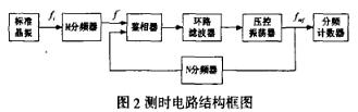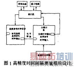 如图 1 所示,该系统主要由高频参考时钟设计,分频计数电路,控制面板和显示电路等部分组成。由单片机实现对各部分的功能初始化软件设计,在测时结束后读取分频计数结果, 按公式(1)计算出时间后送显示电路显示。